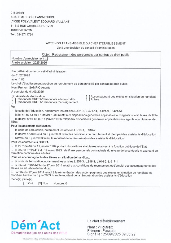 Actes CA Acte 2/ 2025-2026 Recrutement des personnels par contrat de droit public 25 septembre 2025 Sandrine MAUTAINT