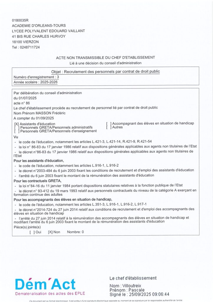 Actes CA Acte 3/ 2025-2026 Recrutement des personnels par contrat de droit public 25 septembre 2025 Sandrine MAUTAINT