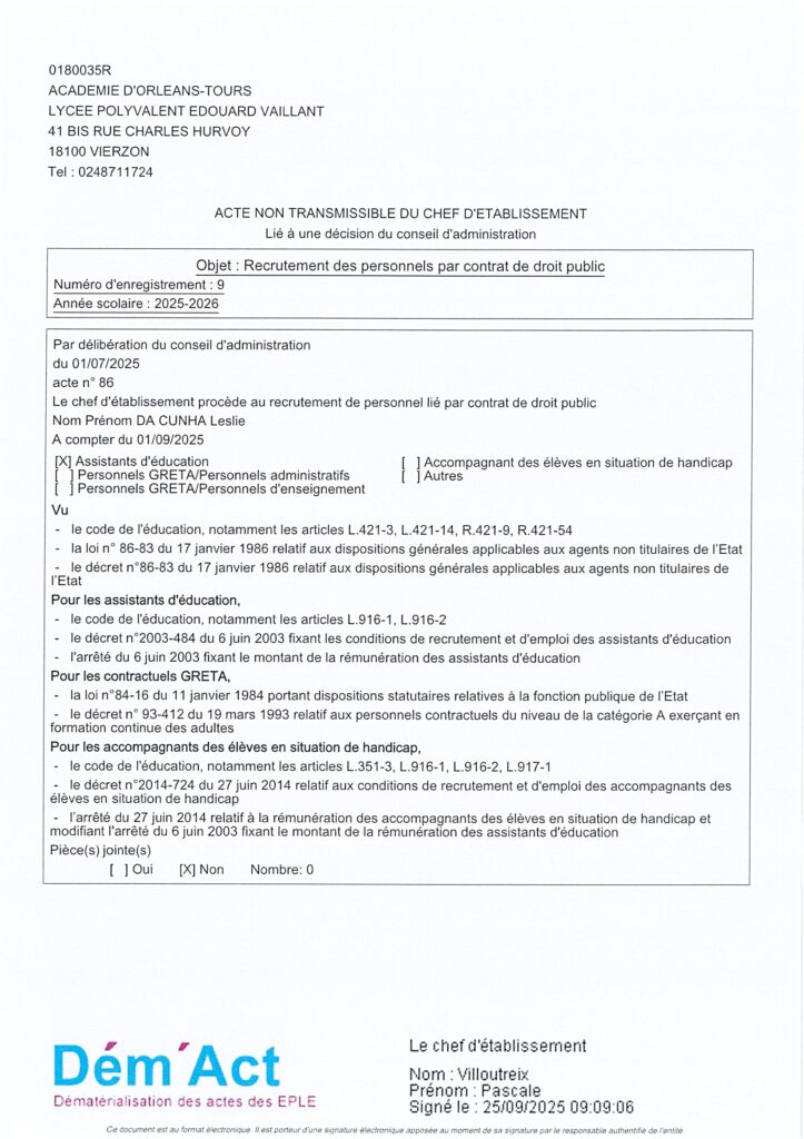 Actes CA Acte 9/ 2025-2026 Recrutement des personnels par contrat de droit public 25 septembre 2025 Sandrine MAUTAINT