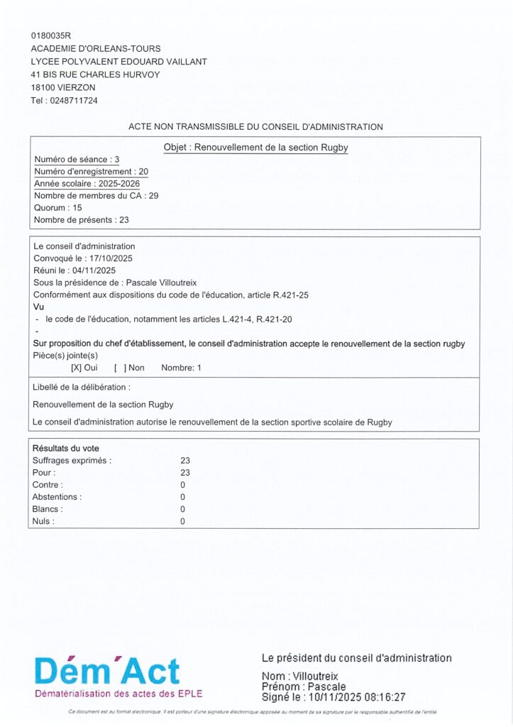 Acte 20/ 2025-2026 Renouvellement de la section Rugby