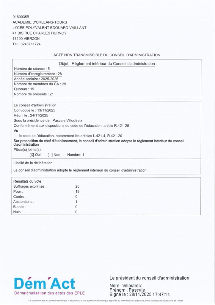 Actes CA Acte 28/ 2025-2026 Règlement intérieur du Conseil d’Administration 1 décembre 2025 Sandrine MAUTAINT