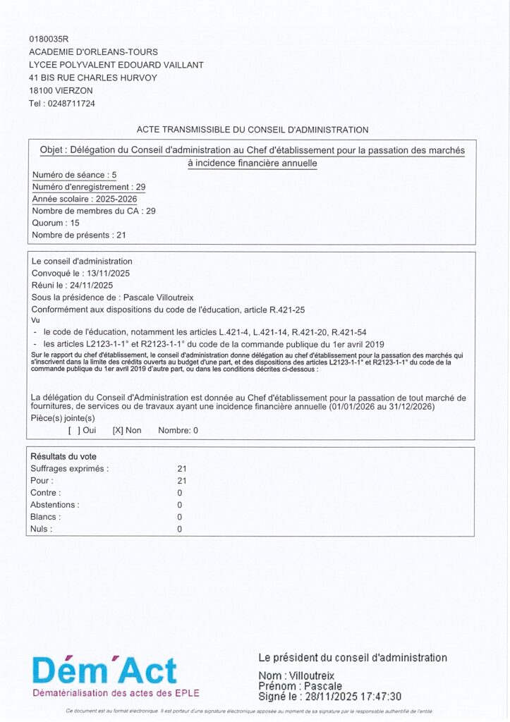 Actes CA Acte 29/ 2025-2026 Délégation du Conseil d’Administration au Chef d’Établissement pour la passation des marchés à incidence financière annuelle 1 décembre 2025 Sandrine MAUTAINT