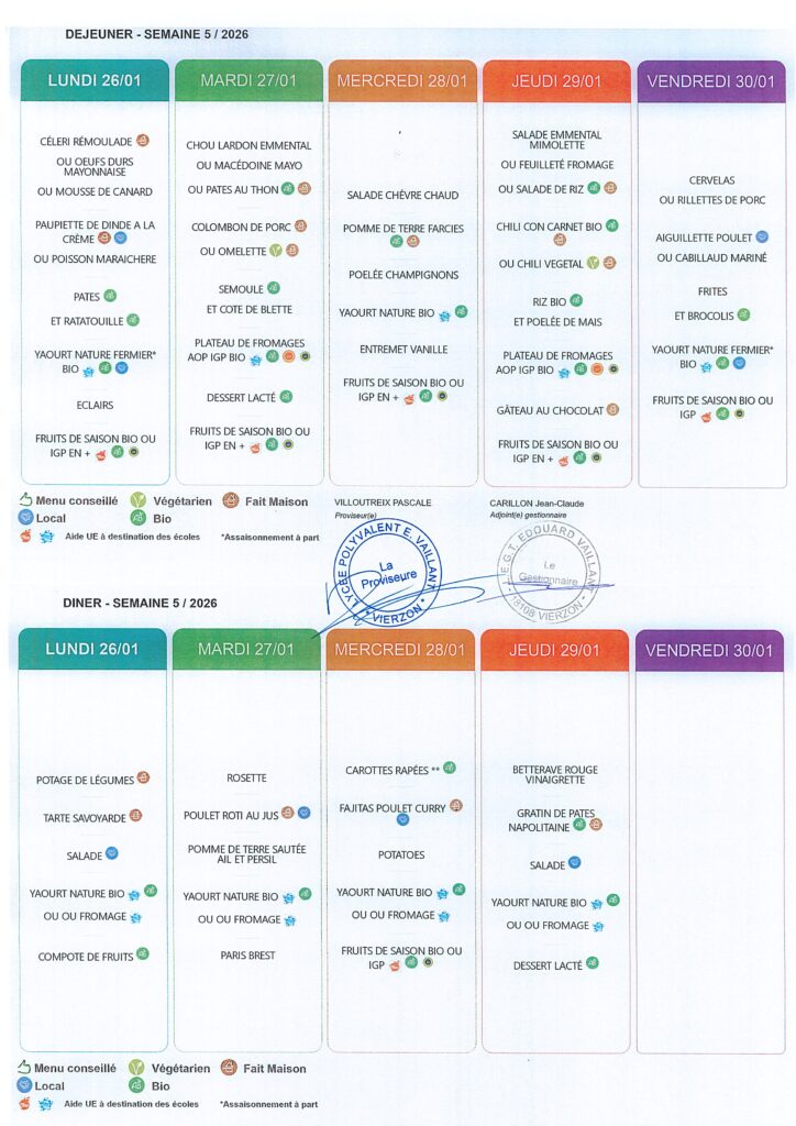 MENUS DU 26 AU 30 JANVIER 2026