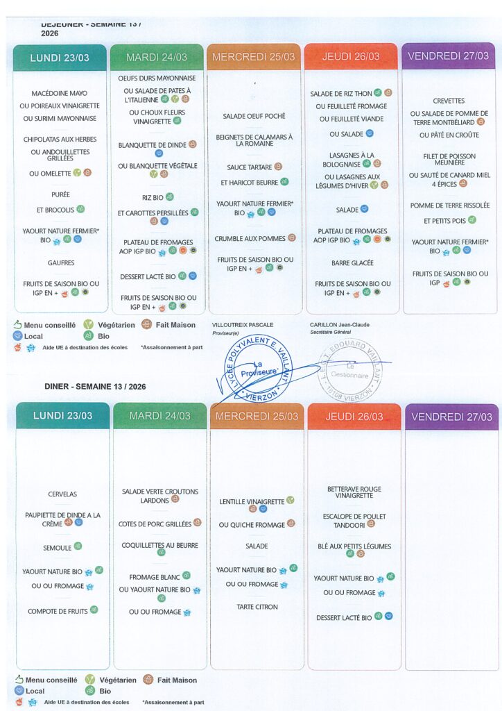 Menus du 23 au 27 Mars 2026