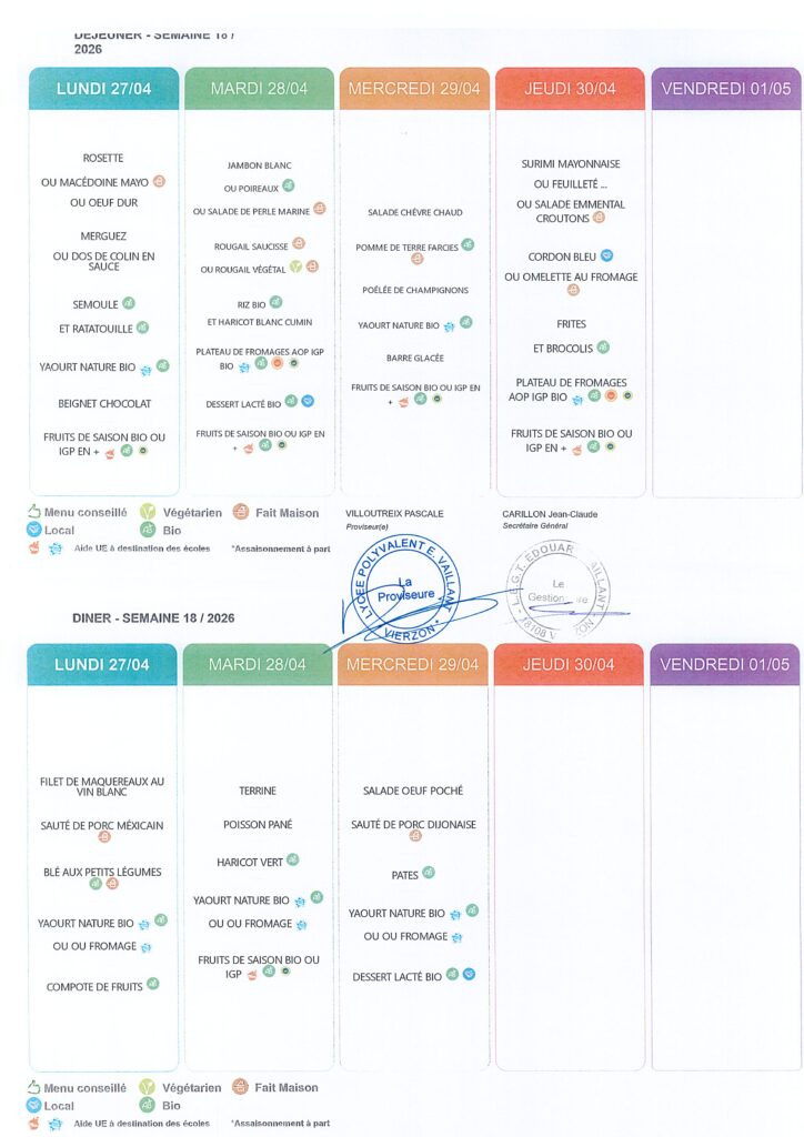 Menus du 27 au 30 Avril 2026
